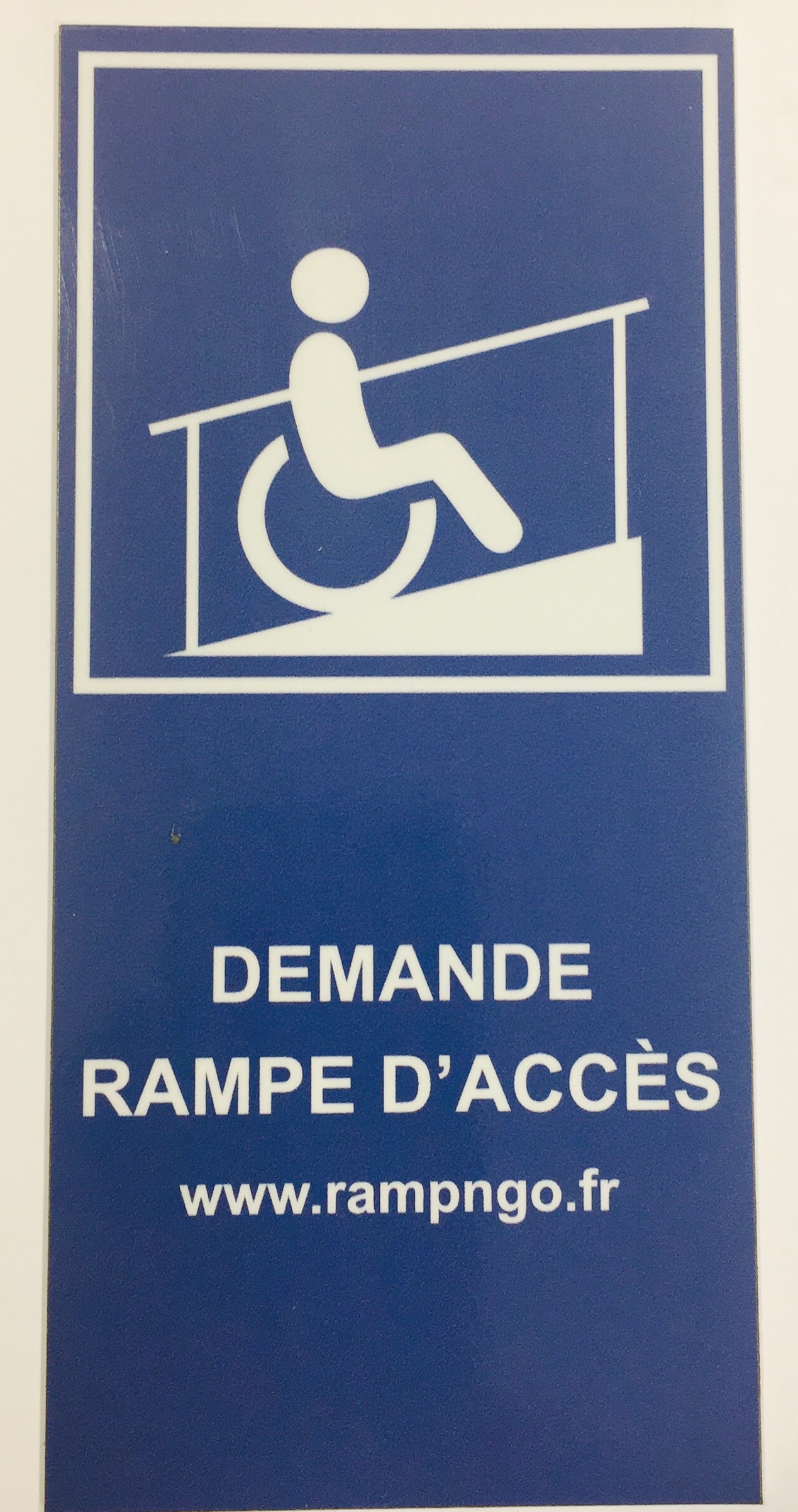 Ce sticker collé à la vitrine d’un ERP, vous n’avez pas besoin d’installer une rampe en entrée d’établissement de façon permanente. Cette signalisation pallie en effet aux éventuels problèmes de voirie ou de trottoir trop étroit.