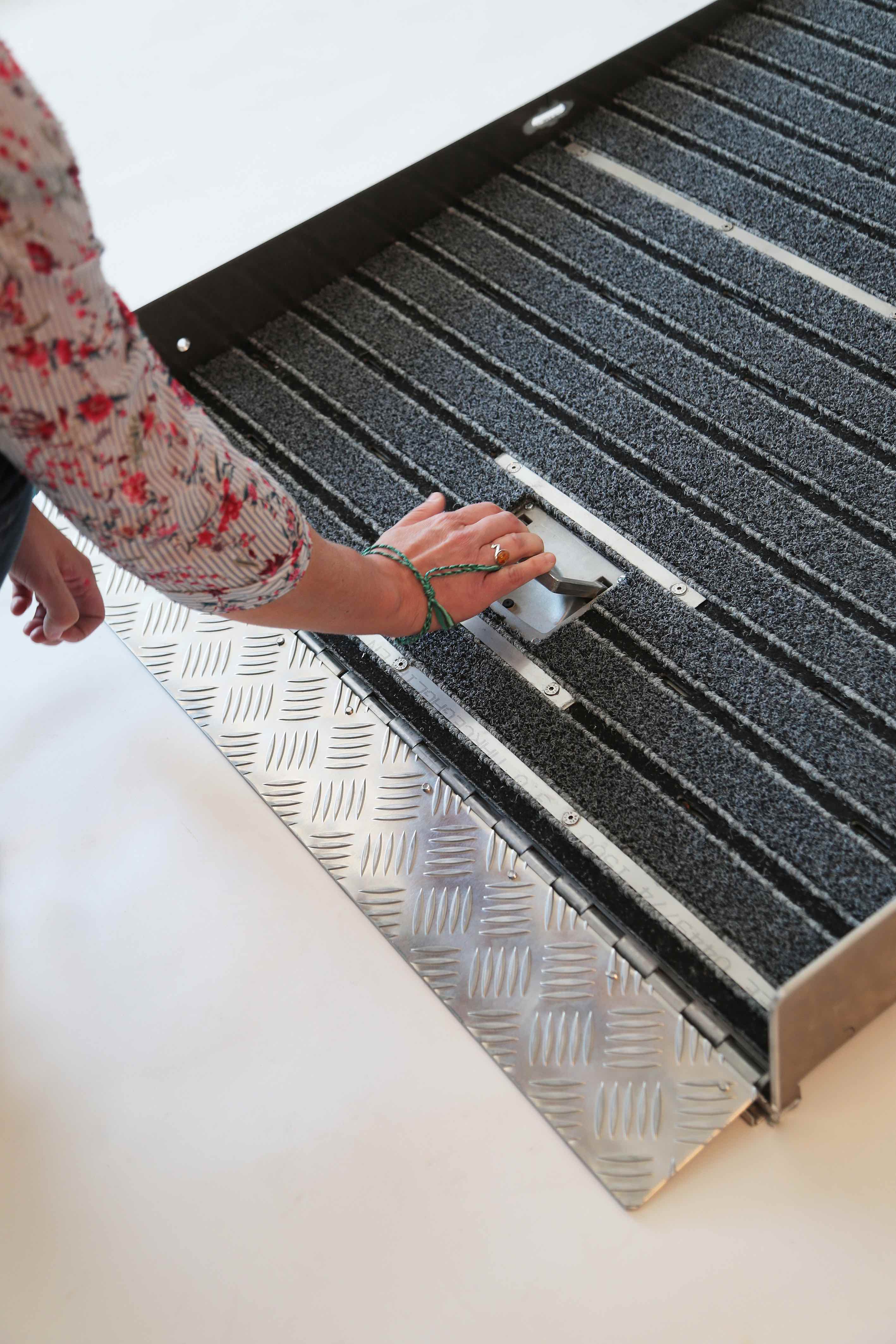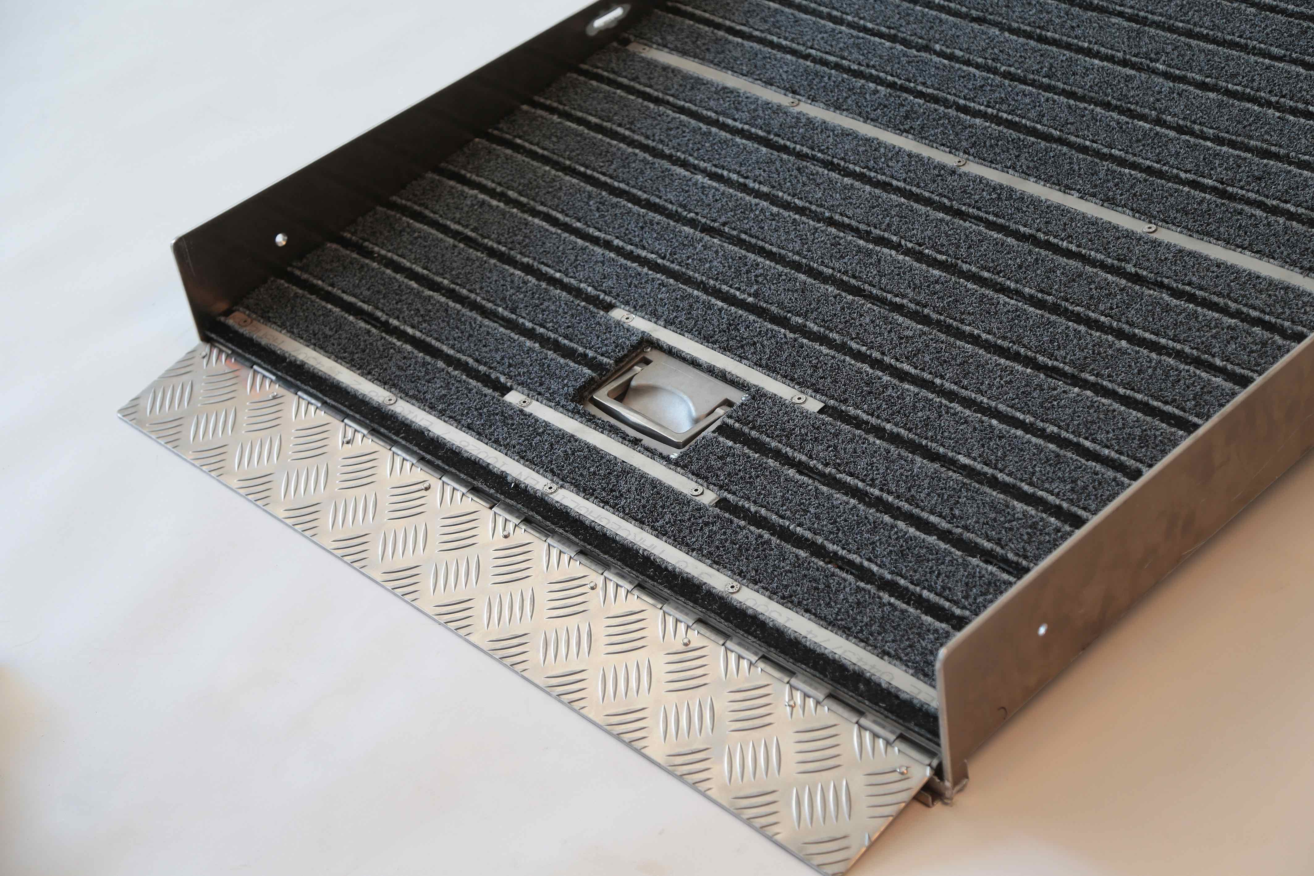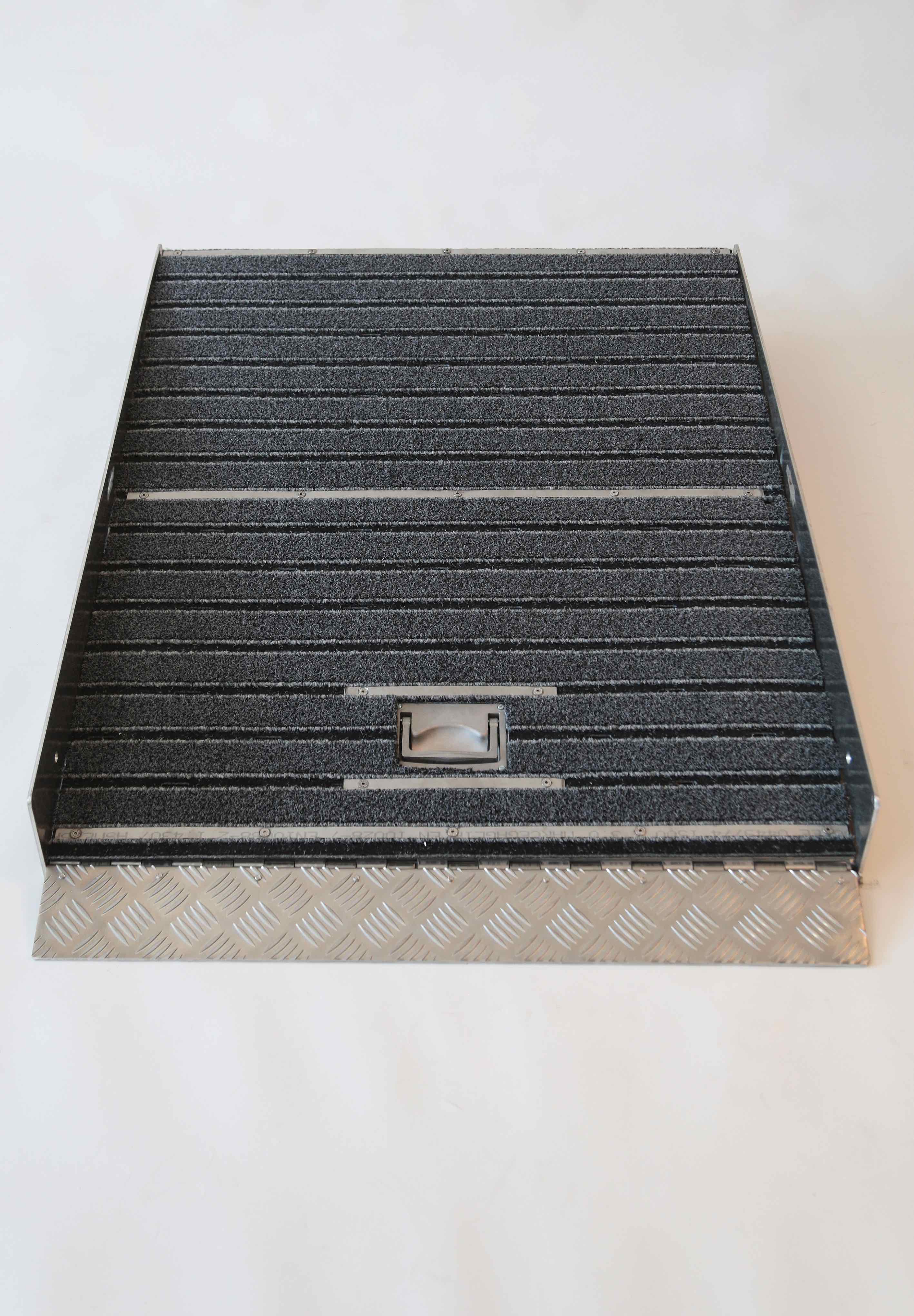 La combi tapis encastrable est une rampe escamotable idéale pour le franchissement de 1 marche. Cette installation est un dispositif encastrable dans le seuil d’un établissement ou espace public. Simple d’utilisation, cette rampe encastrable pour les personnes à mobilité réduite est entièrement conçue en aluminium à damier. Elle est isolée acoustiquement et thermiquement.