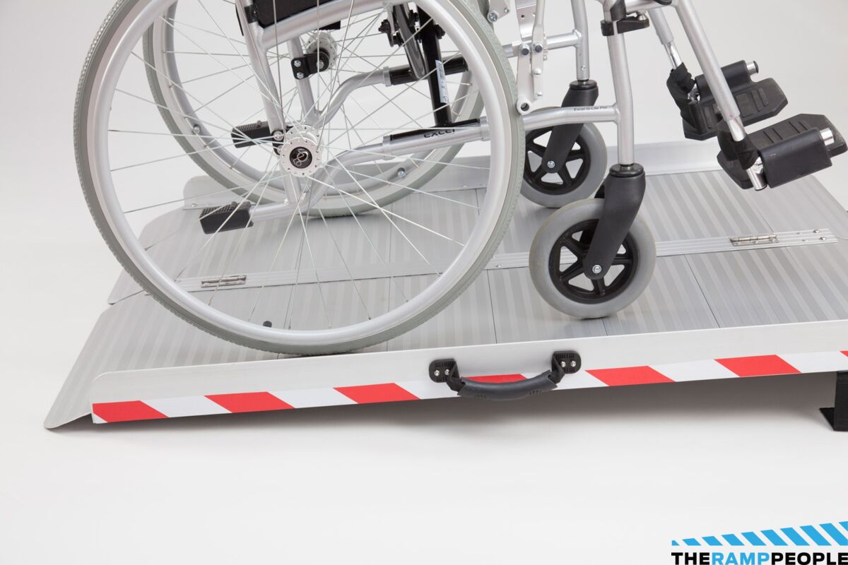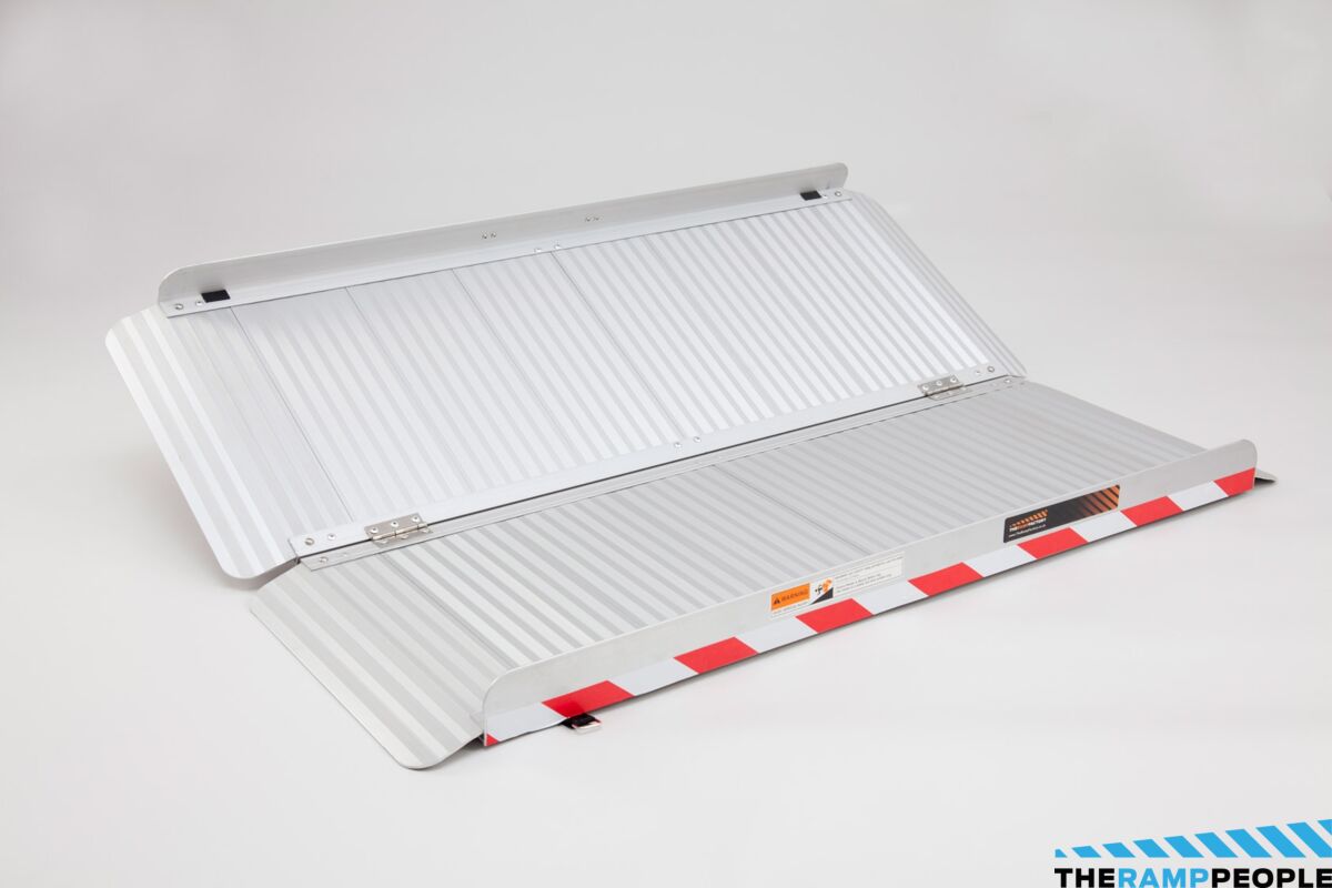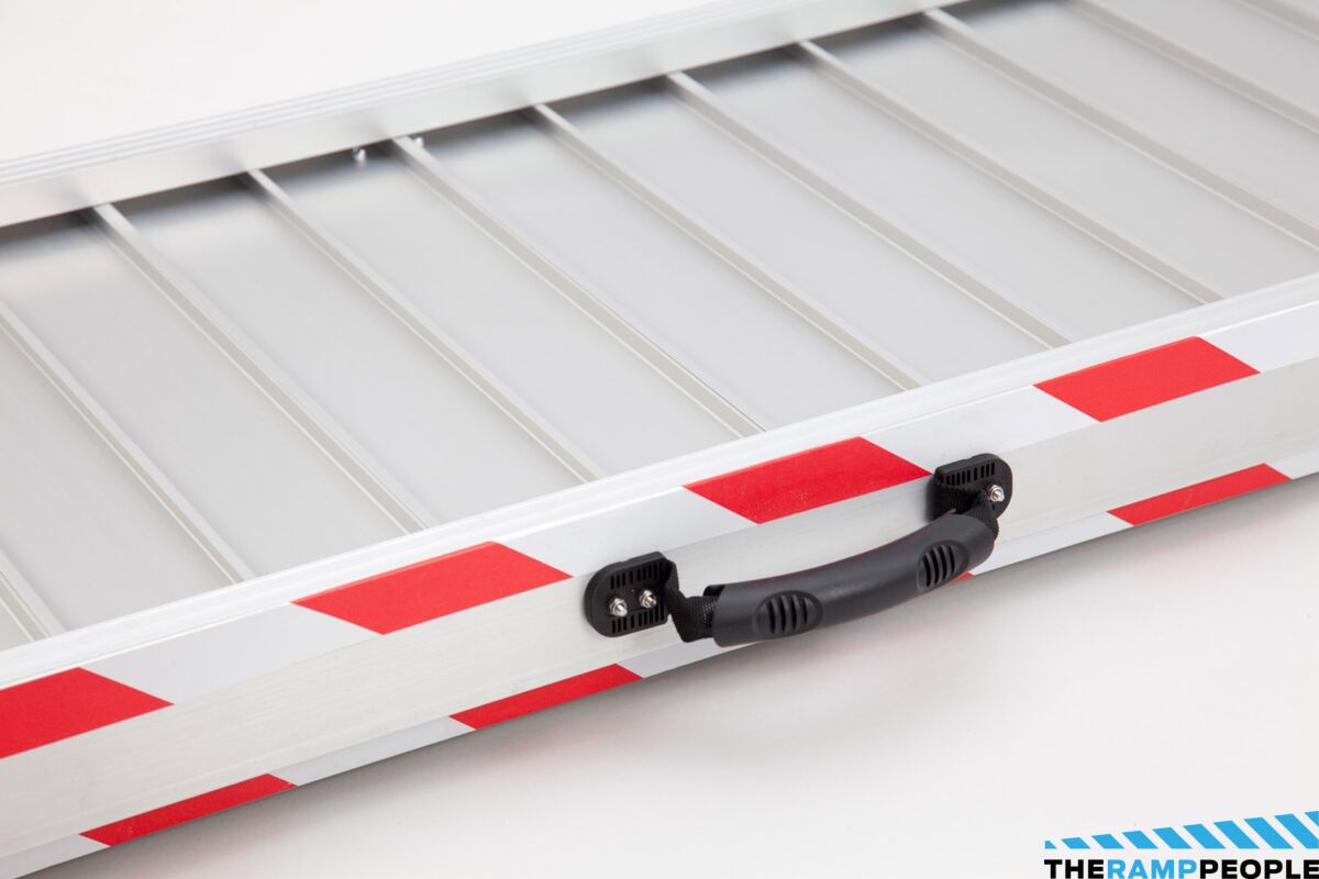 Rampe d'accès pliable et portable. Cette rampe de grande qualité est facile de manipulation. Un revetement antidérapant permet une adhérance optimale.